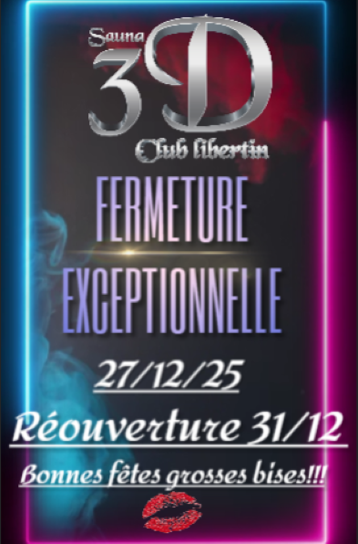 Que vous soyez seul, en couple, ou accompagné de vos amis les plus intimes, au 3D Sauna Club, vous êtes les bienvenus pour explorer les méandres du plaisir, de la passion, et de la luxure. Le club propose des soirées libertines le vendredi soir de 18h à minuit, et des soirées à thèmes le samedi de 21h00 à 04h00. Notre club dispose de tout le confort nécessaire pour une expérience inoubliable : sauna et hammam, terrasse en été, coins câlins intimistes, bar, piste de danse... Au 3D Sauna Club, l'érotisme est une ode à la liberté, où chacun peut explorer ses désirs dans le respect et la bienveillance.