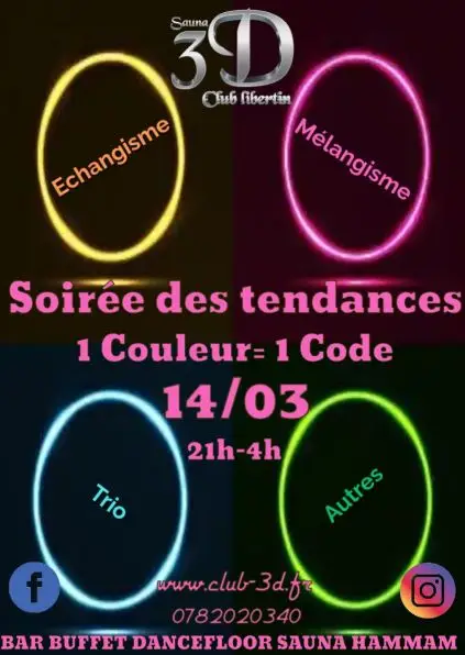 Nos soirées à thème vous promettent des rencontres sensuelles et des moments de complicité inégalés, où tous vos désirs les plus secrets peuvent prendre vie et se matérialiser dans une farandole de couleurs, de lumières tamisées et de corps tournoyants.